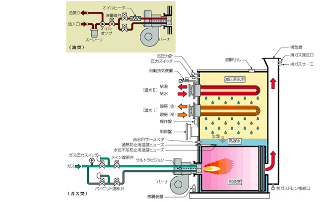 バコティンヒーターはバーナ・燃焼室(火炉)・水管・熱媒水・減圧蒸気室・熱交換器などで構成し、缶体内に空気はなく、かつ完全に外気 と遮断・密閉されています。また、熱媒水は火炉・水管をおおうように封入しています。減圧蒸気室は大気圧以下に減圧された状態に 保っていますから、封入している熱媒水は、バーナによって加熱されると直ちに沸騰し、そのときの熱媒水温度と同じ蒸気を発生します。 缶内で発生した蒸気は、減圧蒸気室内に配置された熱交換器表面で、凝縮することによって水を加温し、水滴となって再び熱媒水に 戻ります。つまり、熱媒水は缶体内で「沸騰ー蒸発ー凝縮ー熱媒水」のサイクルを繰り返しています。したがって、熱媒水の補給も不要で、 空焚きのおそれもありません。